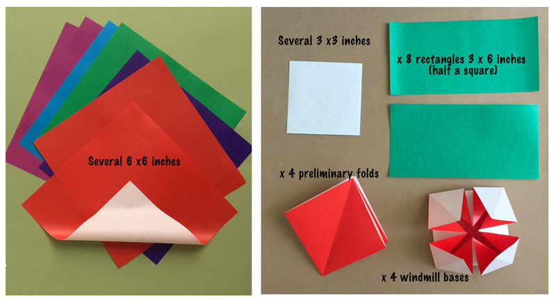 – CUATRO bases de molino de viento dobladas de papel kami de 6×6 pulgadas. Si necesita ayuda para hacer la base del molino de viento por favor siga este video: